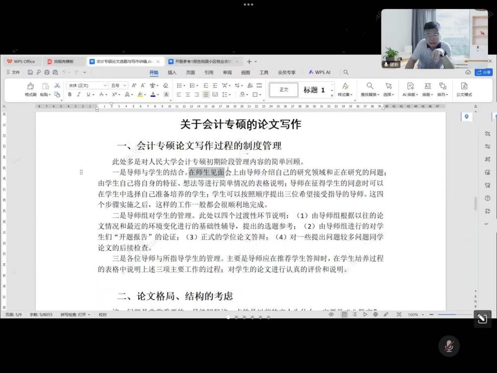 耿建新教授的讲座分为会计专硕论文选题与写作两个模块。在会计专硕论文选题模板,耿教授向大家介绍了会计专硕论文选题的内容表现与细分方向、会计专硕论文选题的一般出处、会计专硕可选论文类型及其与论文内容、方向的匹配等。耿教授强调论文选题需与实践相结合,从实践中根据个人兴趣选择论文选题及论文类型,如案例分析和专题研究等。在会计专硕论文写作模块,耿教授介绍了会计专硕论文写作过程的制度管理、论文格局与结构、对论文案例数据等资料的考虑、论文写作过程要注意的实际问题等,并分享了相关经验。接着,耿教授以4篇代表性会计硕士论文为例,详细介绍了案例论文的选题角度、开题报告的结构与内容、论文结构与内容、论文写作语言表达以及格式的规范性等注意事项。