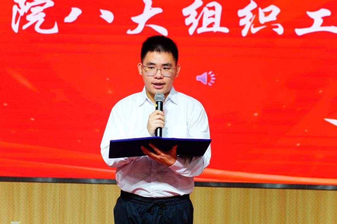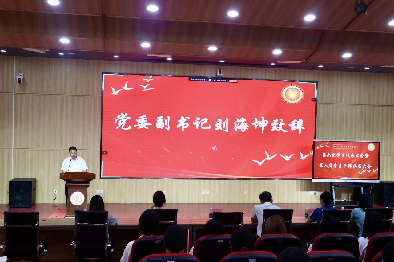 党委副书记刘海坤对到场的领导老师们和同学们致以热烈欢迎。他指出过去一年学生干部八大组织在党委正确领导下,围绕八大工作模块积极作为,开展多项活动获校园文化优秀项目称号,并对新晋干部提出四点要求,强调要强化协同合作、增强主动服务意识、提升综合管理能力、坚持立足实干,鼓励大家赓续学院优良传统,以饱满热情与扎实作风为学院发展贡献力量。